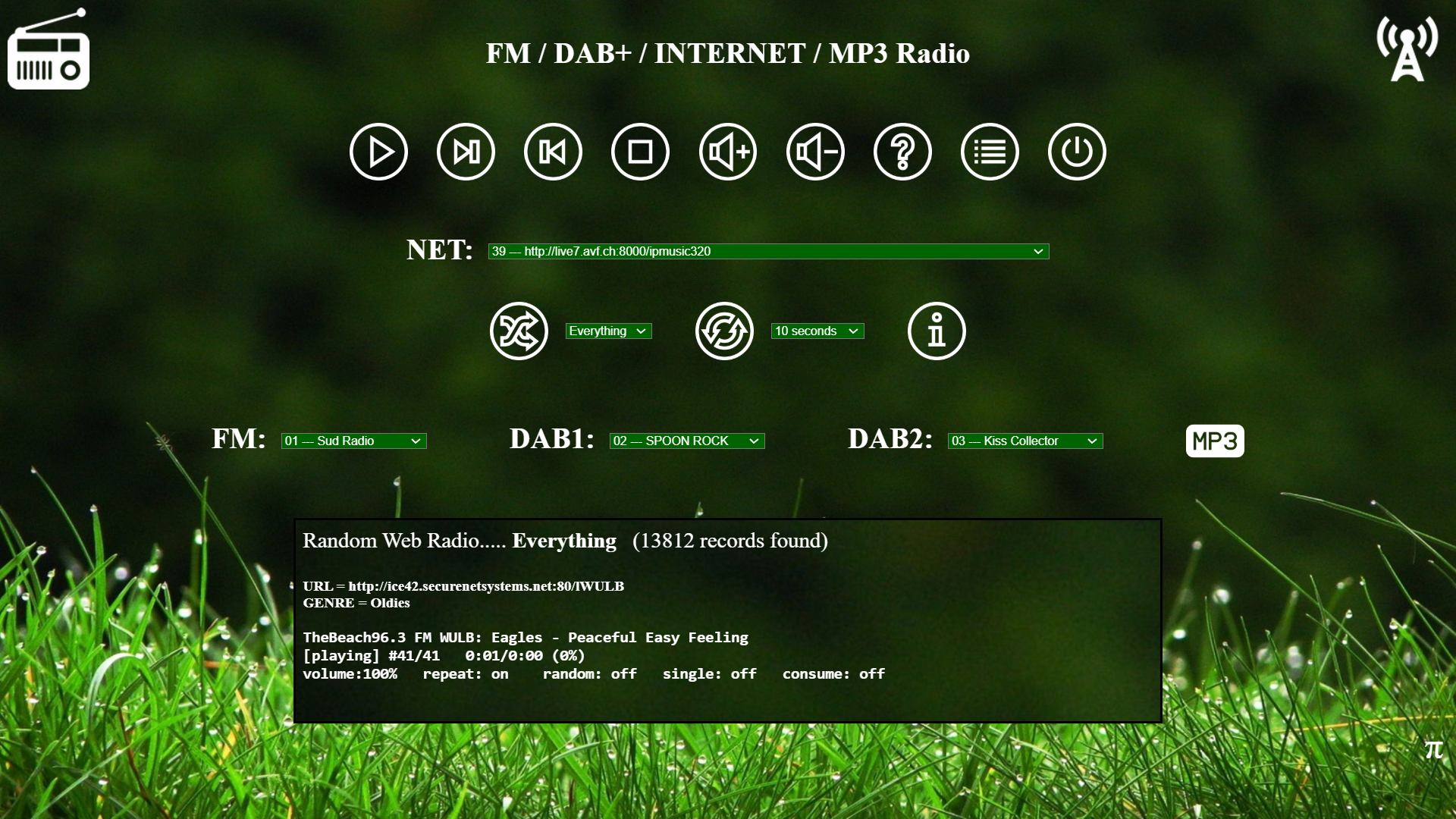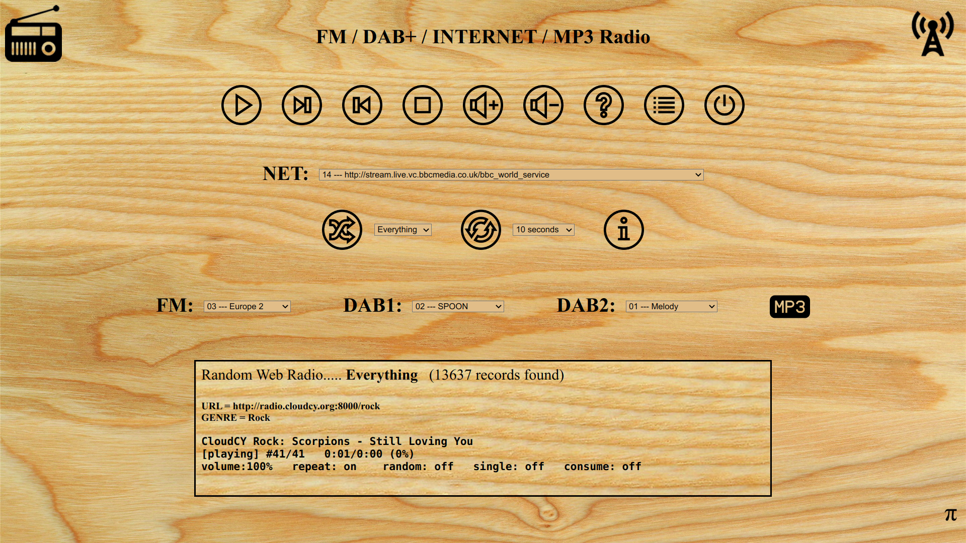 Basically the Arduino (program radio.ino) handles the remote, the leds and the LCD screen then sends commands through serial communication to the Raspberry Pi (program radio.sh). The Pi then executes the commands. Then if requested, the Pi will return some data to the Arduino, like title being played and URL being played. An application on the Pi, NGSoftFM, handles the FM mode thanks to the RTL-SDR dongle. And another application, dab-cmdline, handles the DAB mode, again with the RTL-SDR dongle. For the internet radio mode, including the random mode and of course playing MP3s, I am using VLC. It's a robust / mature software that plays pretty much anything you throw at it! In the web interface (see below for more info and a screenshot), the 40 presets buttons are handled by MPC / MPD, instead of VLC. This is great because it uses very little CPU resources, so your Raspberry Pi stays cool. Unfortunately it doesn't play all the links! VLC is a bit more resource-intensive but also plays more links. |